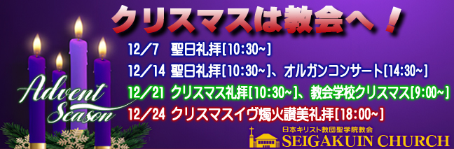 今年の教会のクリスマス礼拝は12月21日(日)となります。また、24日(水)午後6時よりクリスマスイヴ讃美燭火礼拝が行われます。アドヴェントとは「イエス・キリストの降誕を待つ期間であり、また、その後にキリストが再び世に現れる再臨を待ち望む期間」を表し、クリスマスを迎えるための準備期間です。どうぞどなたでも教会においでください。
