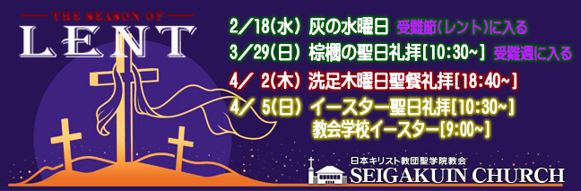 教会では、イースターの46日前を「灰の水曜日(Ash Wednesday)」と呼び、この日から日曜日を除くイースターまでの40日間を「受難節(四旬節・レント)」と呼びます。 この期間は、イエス様が私たちを救うために十字架につけられたご受難を思い起こしながら祈り過ごします。なお、 イースターの3日前の木曜日は「洗足の木曜日」と呼び、聖学院教会では洗足木曜日の礼拝が午後6時40分より行われます。 - 2026年1月1日