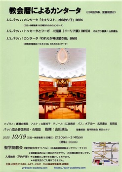 次週10月19日(日)聖日礼拝後、午後2時半よりバッハ協会管弦楽団・合唱団によるコンサート(聖学院教会協賛)が行われます。入場無料(任意によるご寄付をお願いします)です。どうぞどなたでもお越し下さい。